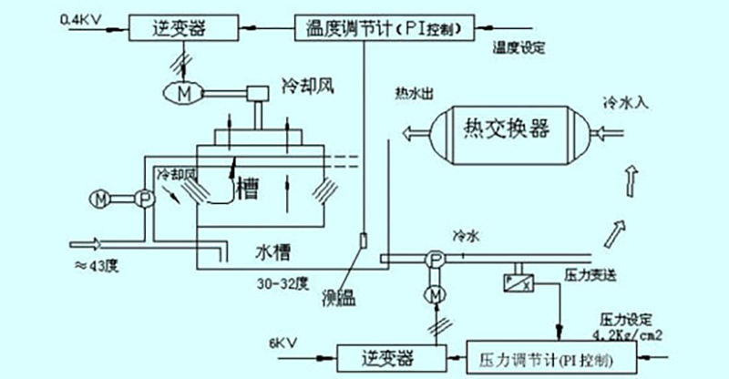 冷卻風(fēng)扇變頻調(diào)速是一個溫度閉環(huán)控制系統(tǒng)。熊貓水泵廠舉例證明,例如:儲水池水溫設(shè)定為30℃,如果實測水溫高于30℃,則會自動增加輸出頻率→提高風(fēng)扇轉(zhuǎn)速→增強冷卻效果→儲水池內(nèi)水溫降下來,反之亦然。
